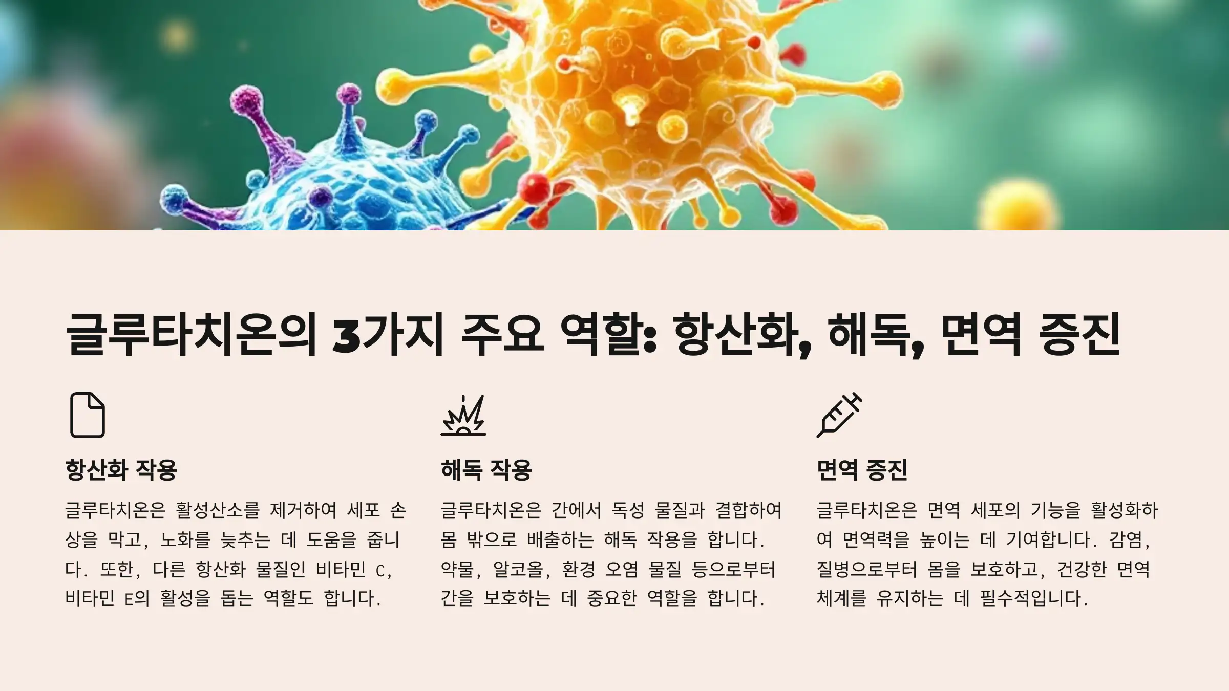 글루타치온은 우리 몸에서 해독 작용부터 면역력 강화, 노화 방지까지 다양한 역할을 하고 있어요.