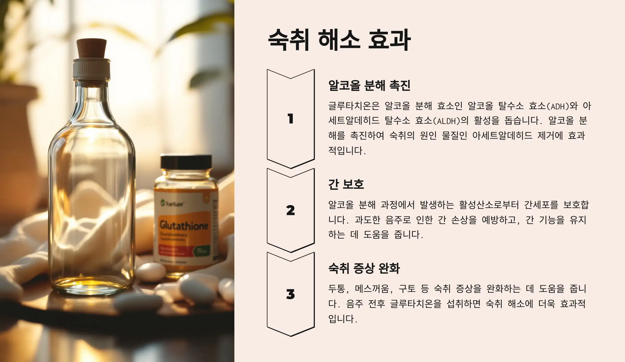 ✔ 숙취 해소를 위한 글루타치온 섭취 팁: 🍋 비타민C와 함께 복용하면 효과가 배가됩니다! 🥦 브로콜리, 🥑 아보카도 등 글루타치온이 풍부한 음식도 챙겨 드세요!