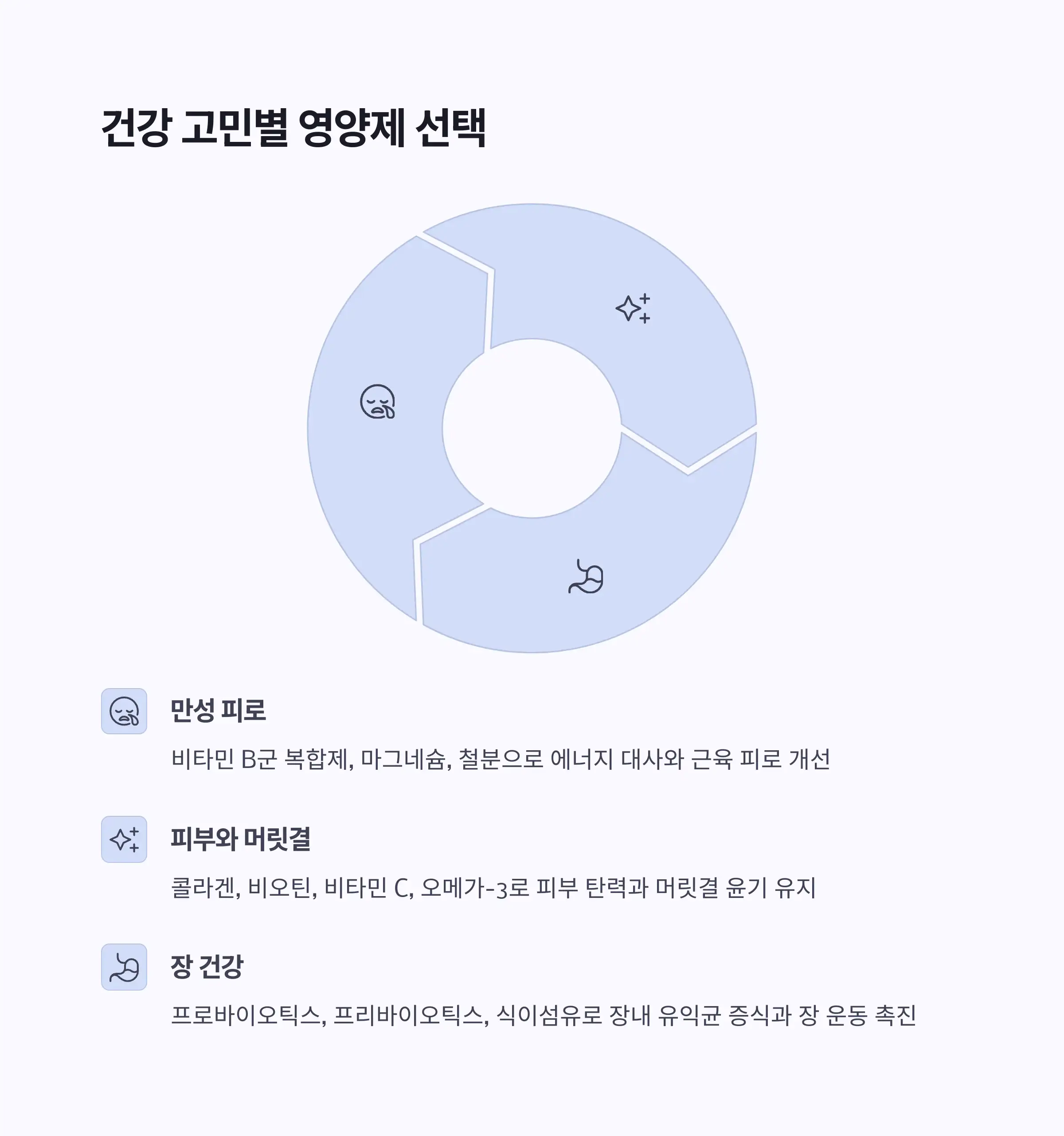 - 건강 고민별 선택: 피로, 피부/머릿결, 장 건강 등 개인이 겪는 문제에 따라 필요한 영양소 조합을 선택해야 합니다.
