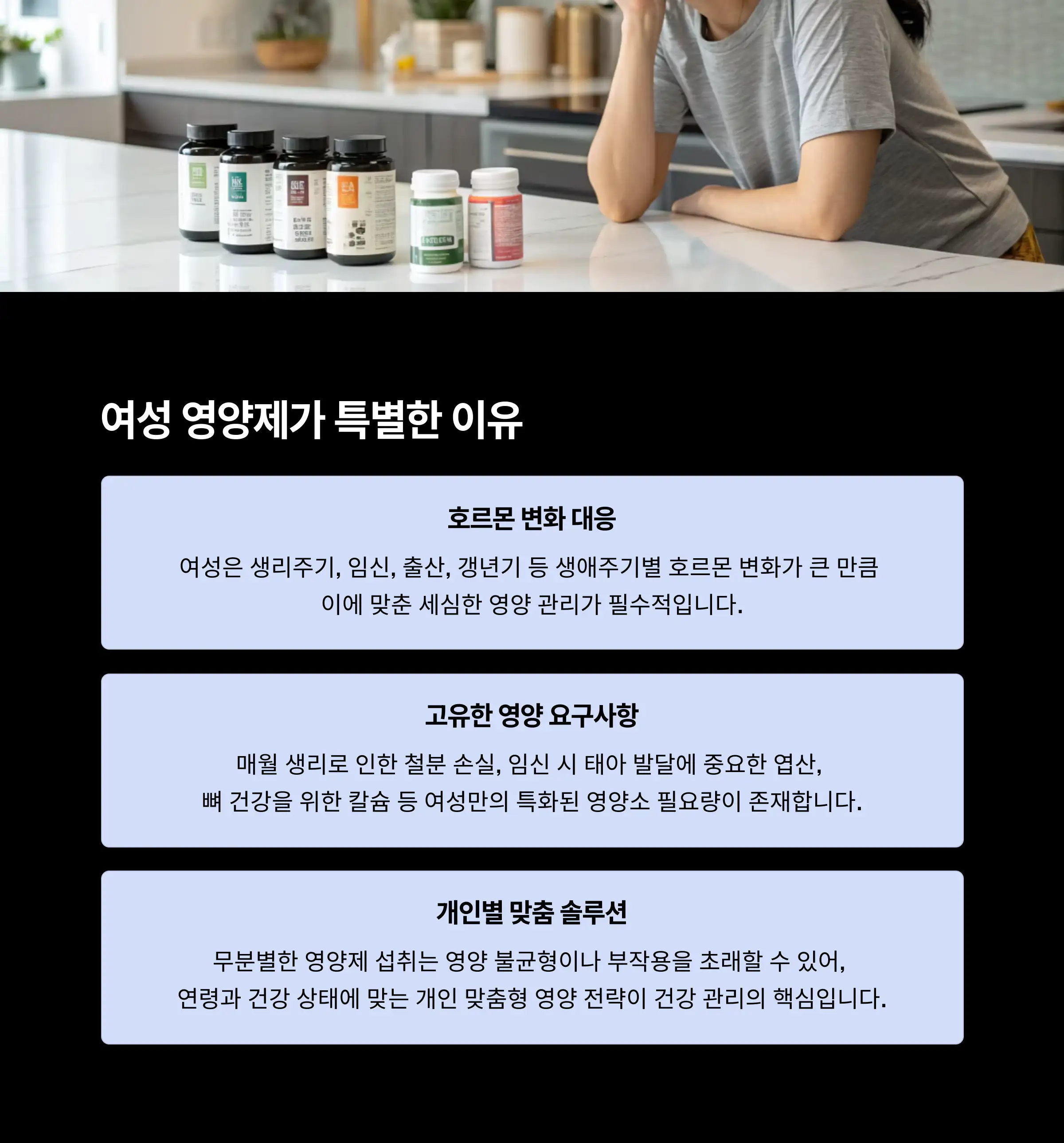 - 여성 맞춤 영양제의 중요성: 호르몬 변화, 임신, 출산, 갱년기 등 여성의 생애 주기에 따라 필요한 영양소가 다르므로 맞춤형 접근이 필수적입니다.