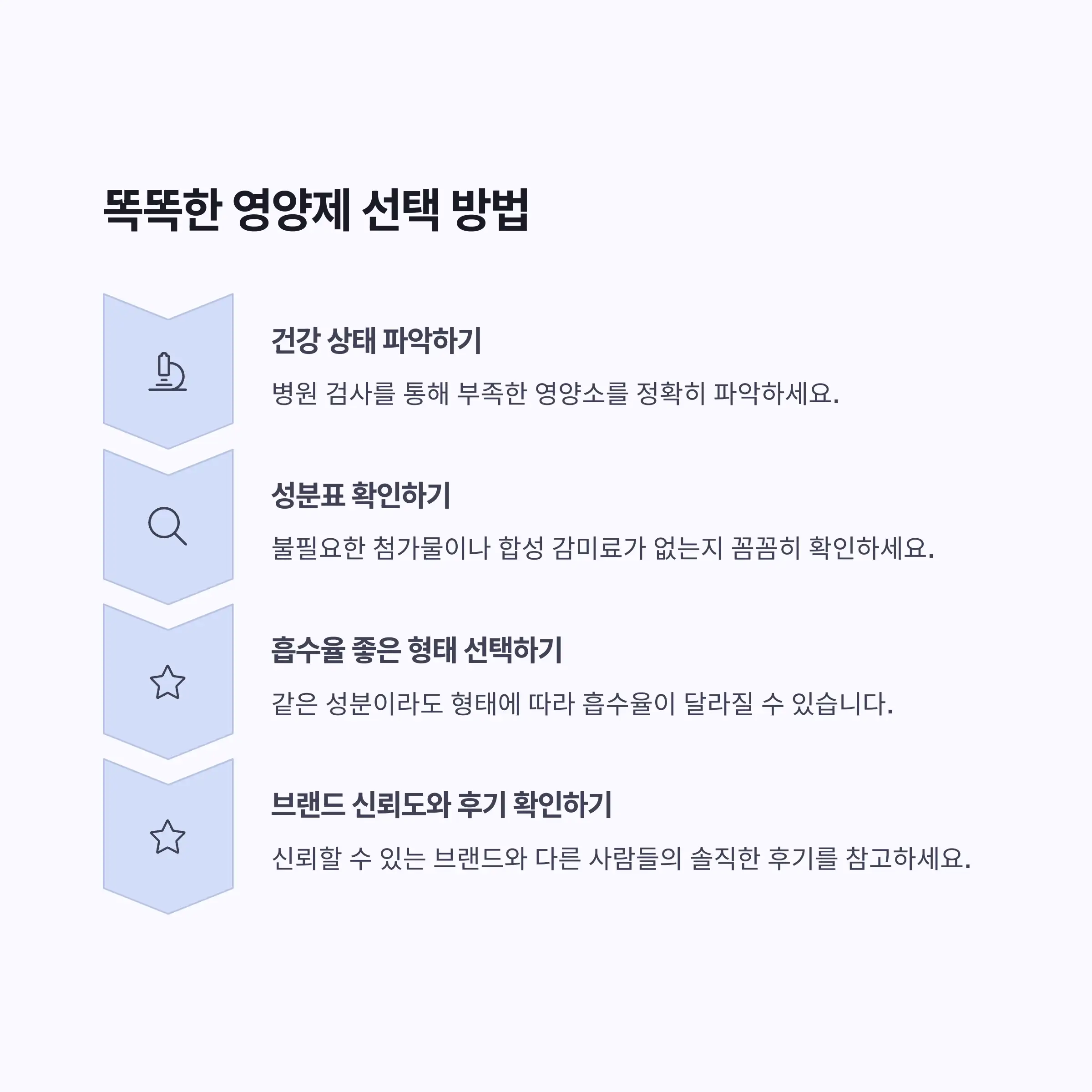 - 똑똑한 영양제 선택 팁: 건강 상태 파악, 성분표 확인, 흡수율 고려, 브랜드 신뢰도, 후기 참고가 현명한 선택을 위한 핵심입니다.