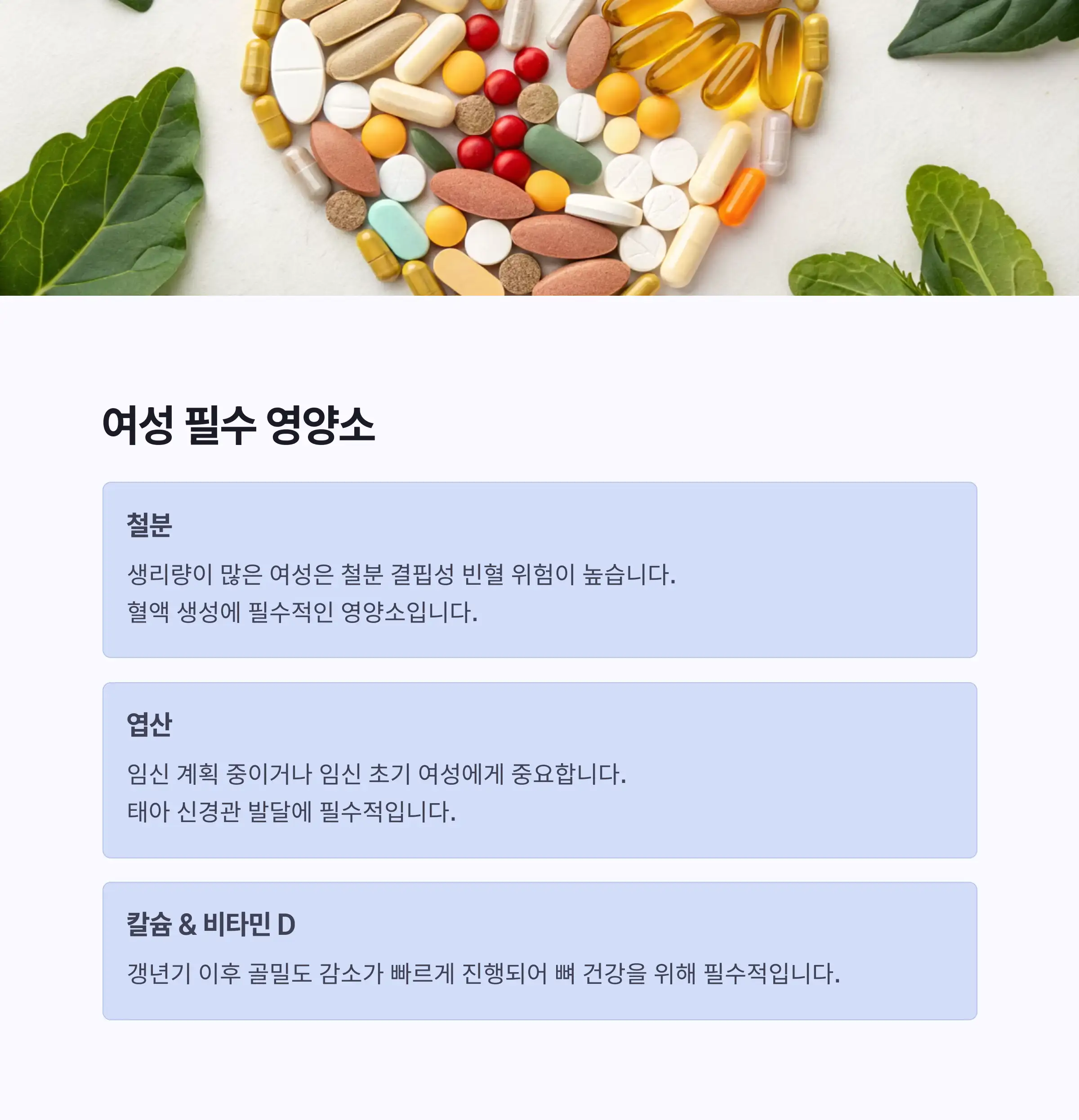 - 여성 필수 영양소: 철분, 엽산, 칼슘, 비타민 D, 마그네슘, 오메가-3, 유산균 등은 여성 건강에 특히 중요한 영양소입니다.