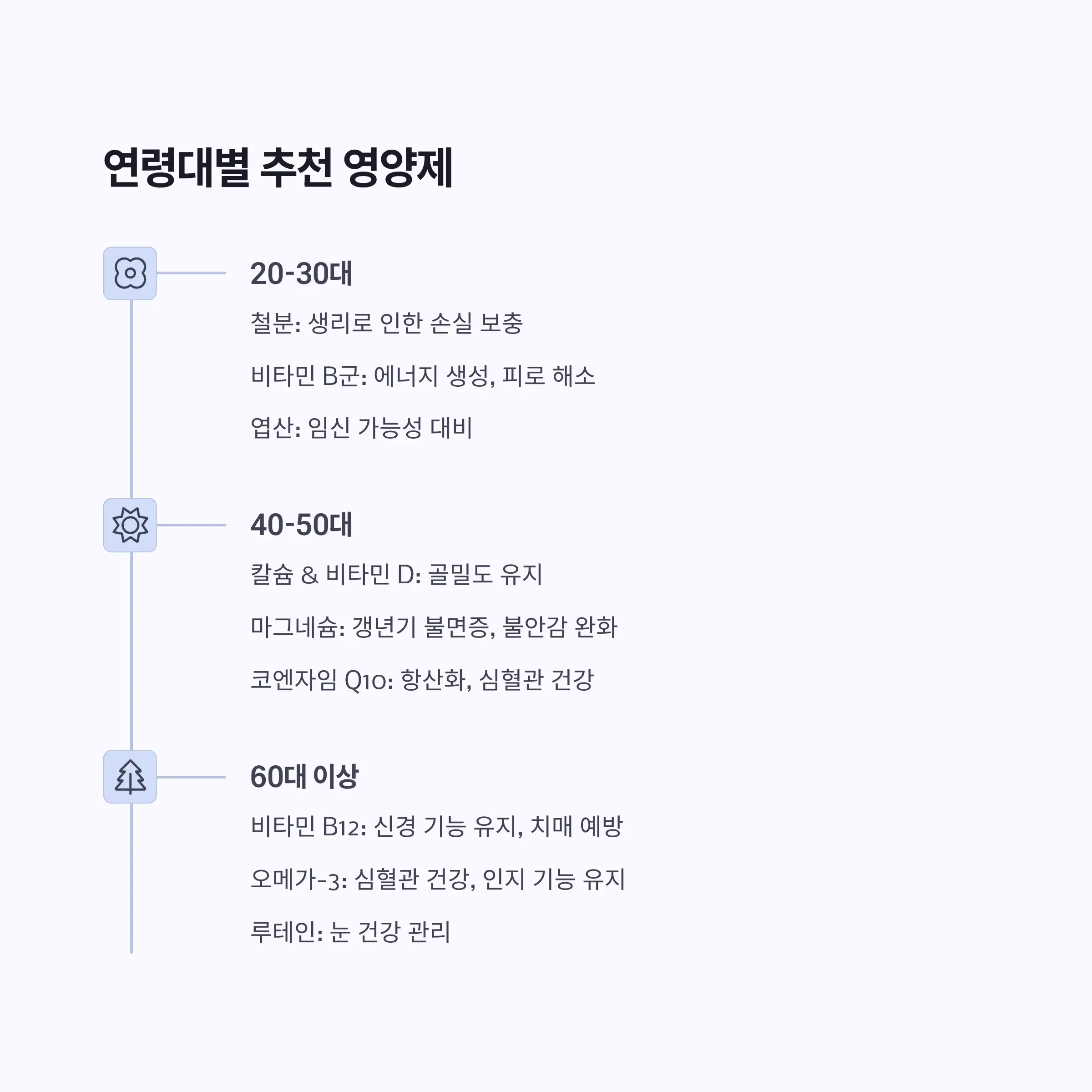 - 연령대별 추천: 20-30대 (철분, 비타민 B군, 엽산), 40-50대 (칼슘, 비타민 D, 감마리놀렌산), 60대 이상 (칼슘, 비타민 D, 비타민 B12, 루테인) 등 나이에 맞는 영양 섭취가 중요합니다.