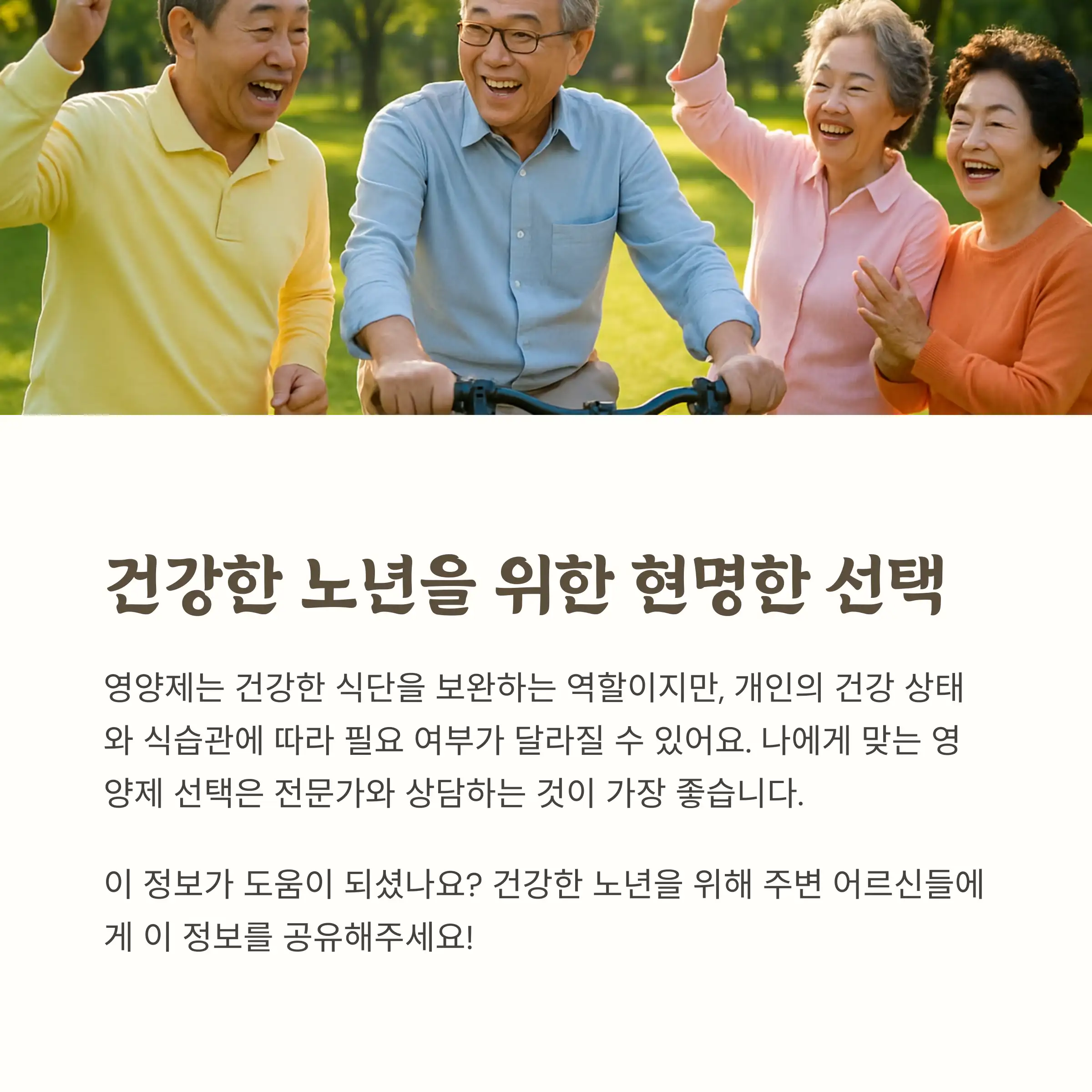 어떠셨나요? 노년층 건강을 위한 영양제, 이제 좀 감이 잡히셨을까요? 물론 영양제도 중요하지만, 가장 중요한 건 균형 잡힌 식단과 꾸준한 운동이라는 점 잊지 마세요! 이 글이 여러분이나 부모님의 건강한 노년을 위한 작은 도움이 되었으면 좋겠네요. 더 궁금한 점이 있다면 언제든지 댓글로 물어봐주세요~ 😊