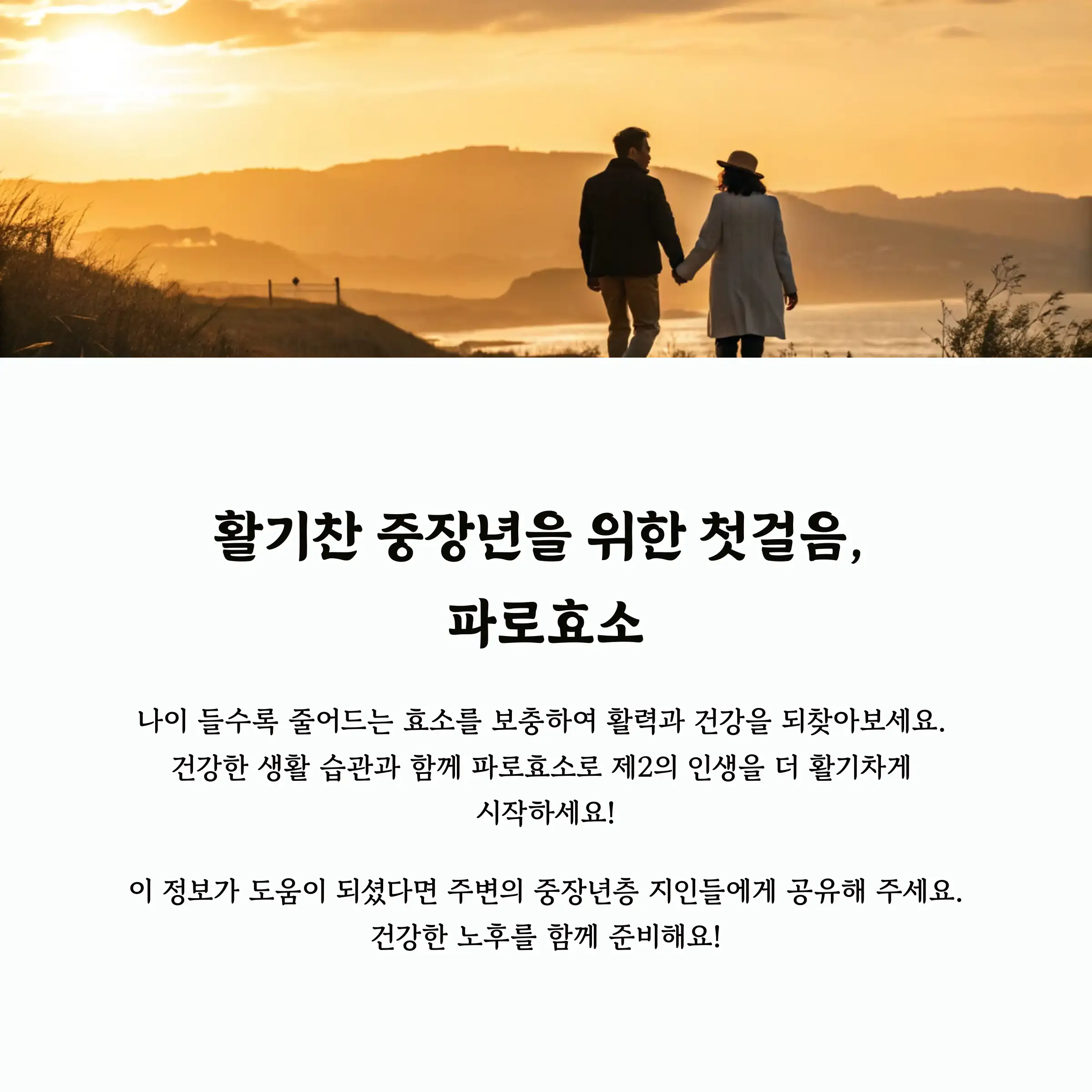 오늘은 중장년층에게 왜 효소가 중요한지, 그리고 파로효소가 우리 몸에 어떤 긍정적인 변화를 가져다줄 수 있는지 자세히 알아봤어요. 저도 이 글을 쓰면서 파로효소에 대한 믿음이 더욱 단단해졌답니다. 😊 여러분도 오늘부터 파로효소와 함께 활기찬 제2의 인생을 시작해 보시는 건 어떠세요? 혹시 더 궁금한 점이 있다면 언제든지 댓글로 물어봐 주세요! 제가 아는 선에서 최선을 다해 답변해 드릴게요~ 😊