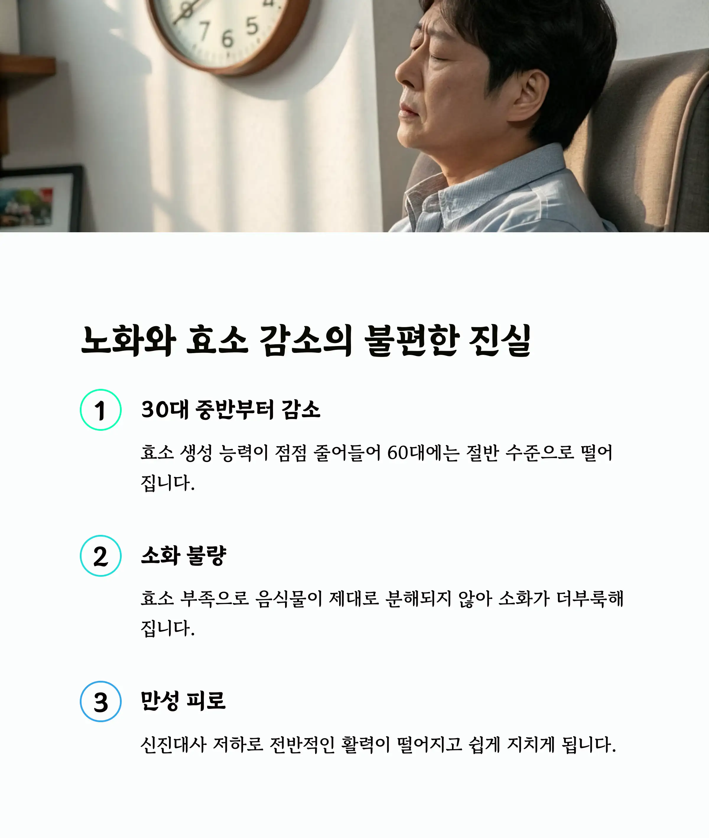 - 노화와 효소 감소: 나이가 들수록 효소는 줄어들고, 이는 에너지 저하와 신체 기능 약화의 원인이 될 수 있어요.