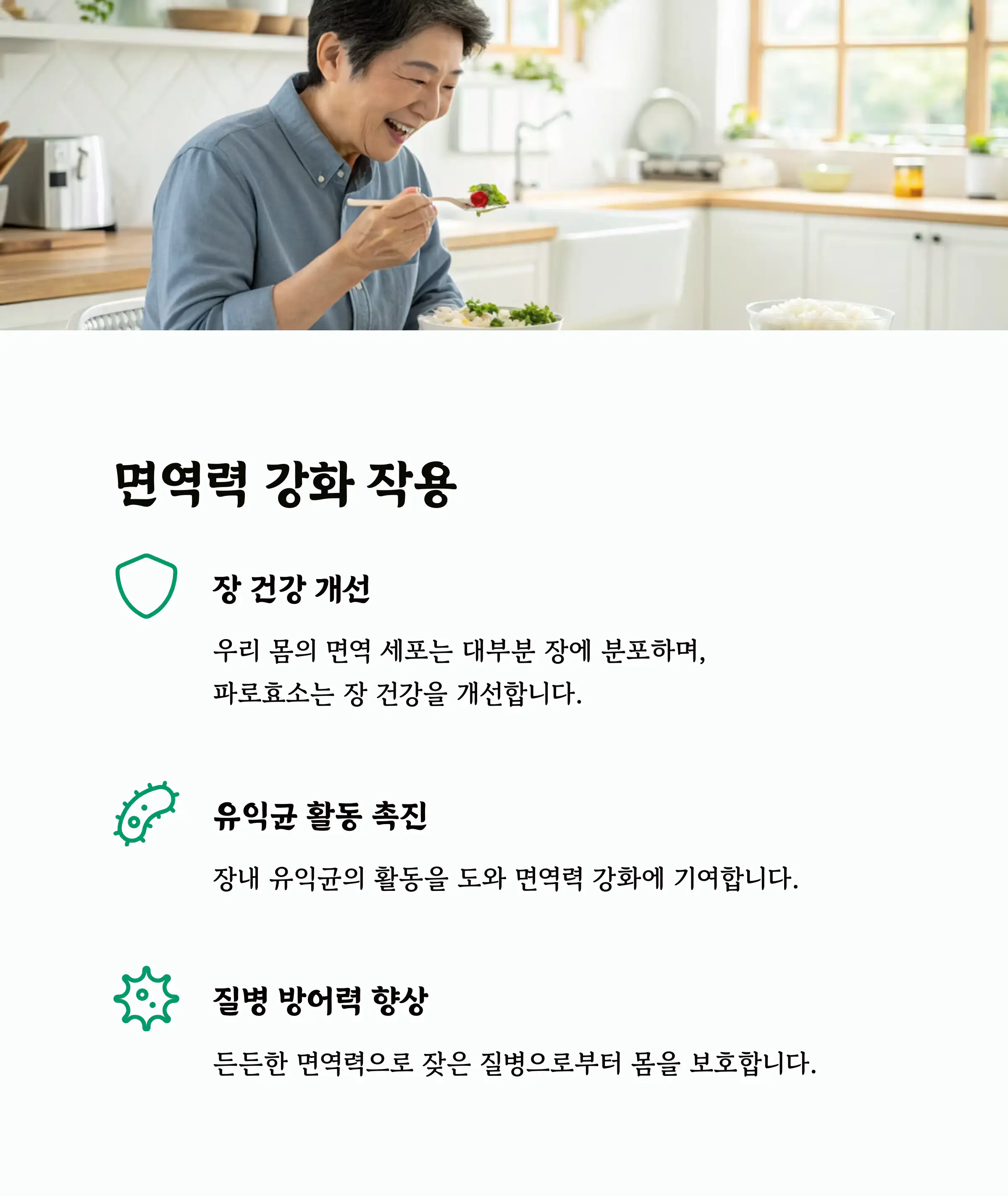 환절기마다 감기를 달고 살던 제가 파로효소에 관심을 갖게 된 또 다른 이유예요. 우리 몸의 면역 세포는 대부분 장에 분포하고 있다는 사실, 알고 계셨나요? 파로효소는 장 건강을 개선하고 유익균의 활동을 돕기 때문에, 자연스럽게 면역력 강화에도 도움을 줄 수 있답니다. 든든한 면역력은 잦은 질병으로부터 우리 몸을 지켜주는 든든한 방어막이 되어줄 거예요! 💪