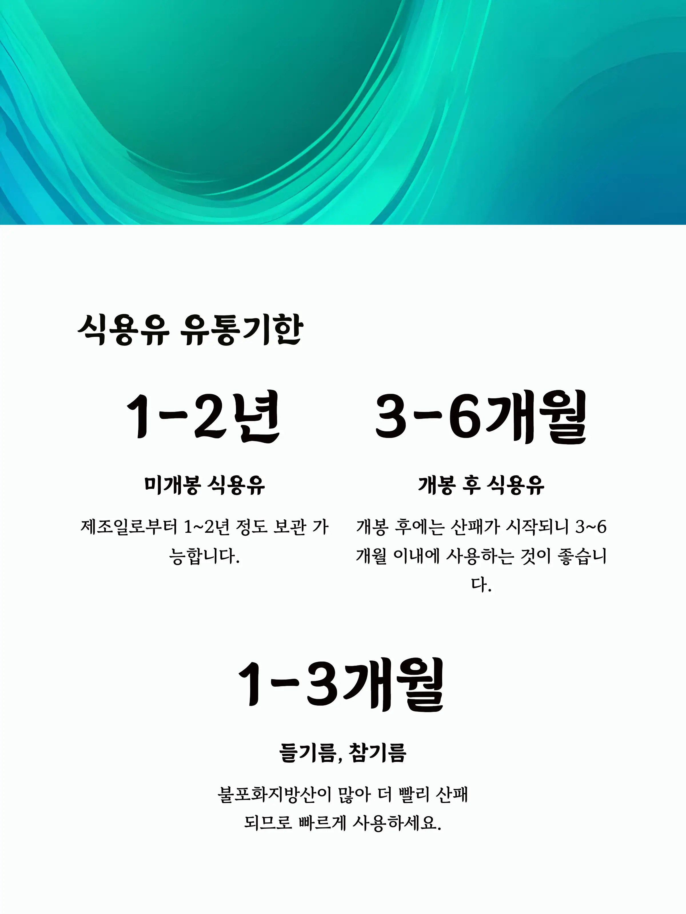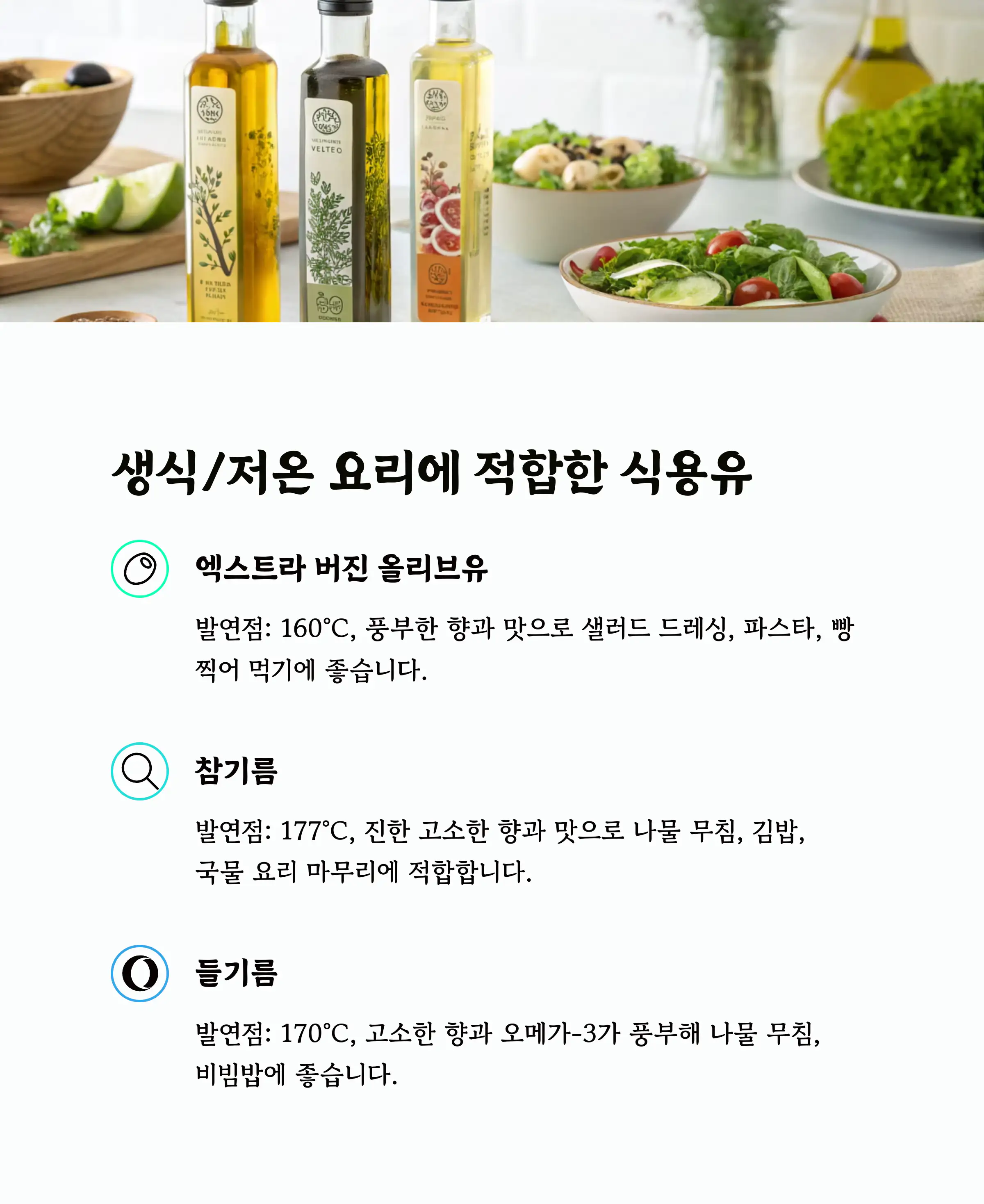 | 들기름 | 특유의 고소한 향과 맛이 강하고, 오메가-3가 풍부해요. | 나물 무침, 비빔밥 등 향을 살리는 요리 (생식) | 170°C (낮음) |