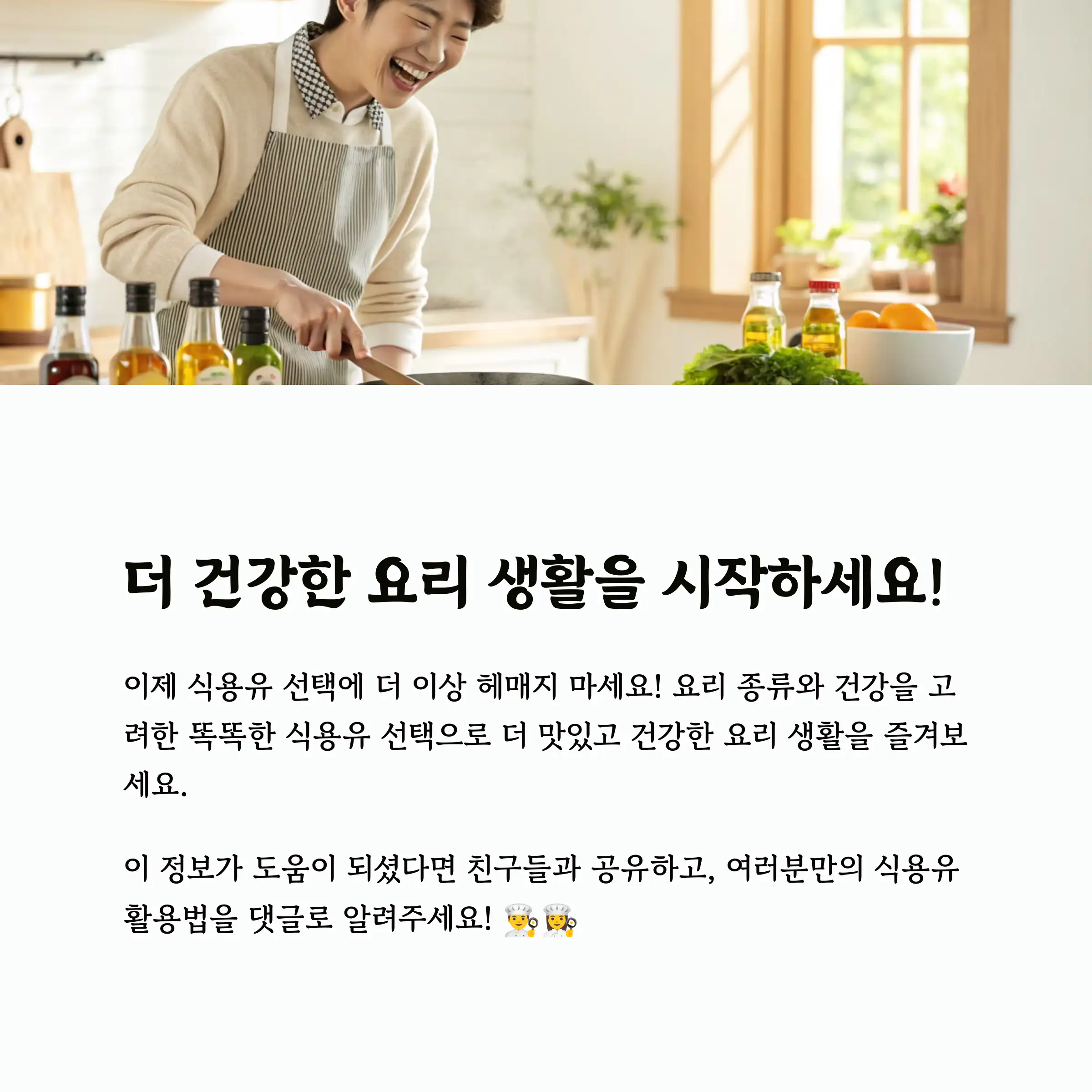이제 주방에서 식용유를 고를 때 더 이상 헤매지 않으시겠죠? 요리 종류와 건강까지 생각해서 똑똑하게 식용유를 활용하시길 바라요! 혹시 더 궁금한 점이 있다면 댓글로 언제든지 물어봐 주세요~ 😊