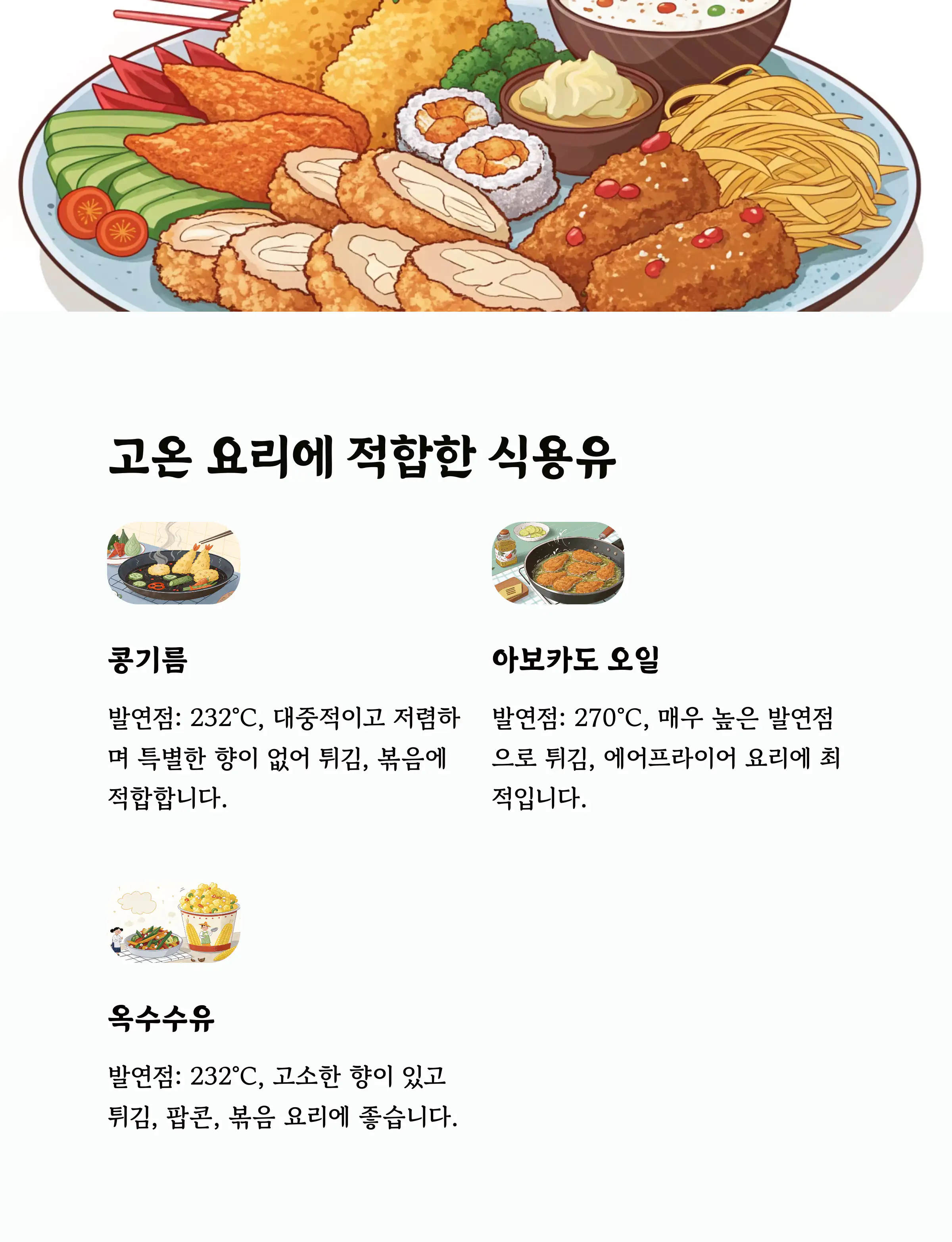 | 아보카도 오일 | 발연점이 매우 높아 고온 요리에 적합하고, 영양가도 높아요. | 튀김, 볶음, 에어프라이어 요리, 구이 | 270°C |
