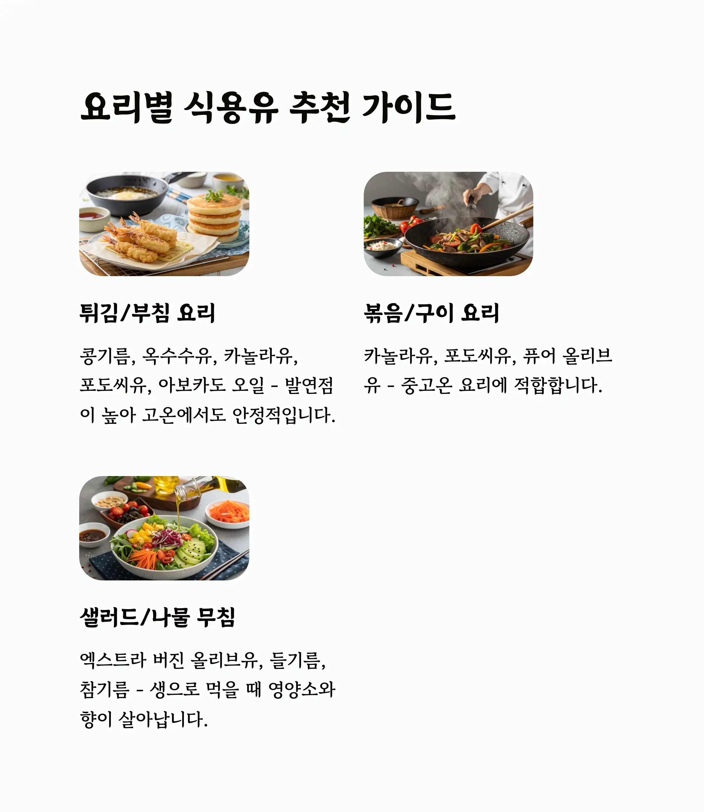 | 카놀라유 (채종유) | 맛과 향이 적고, 비교적 저렴하며 활용도가 높아요. | 튀김, 부침, 볶음 등 거의 모든 요리 | 205°C |